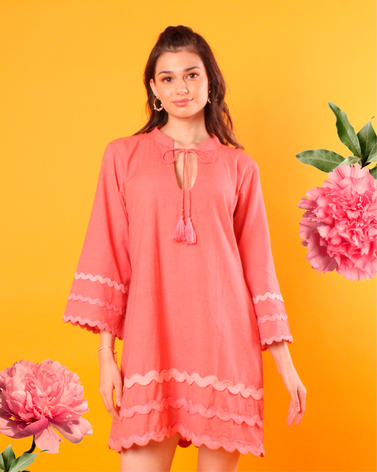 Crafted from organic linen cotton blend , our carnation Tunic Dress features a relaxed fit with a drawstring collar adorned with tassel accents. Delicate shaded ombre lace detailing on the sleeves and hem adds a touch of elegance.
